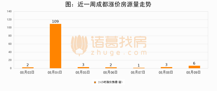 根据诸葛找房数据显示,成都24小时涨价房源量为6套,较08月08日增加3套,环比上涨100%。与此同时,涨价房源占比小幅扩大,业主信心有所提升。