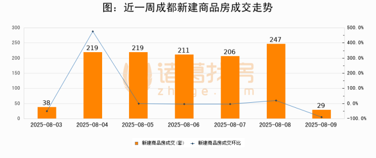根据成都市住房和城乡建设局数据显示,2025年08月09日成都新建商品房成交29套,较昨日减少218套,环比下降88.3%。近一周成都新建商品房日均成交167套。08月09日单日成交29套,低于近一周平均水平82.6%。