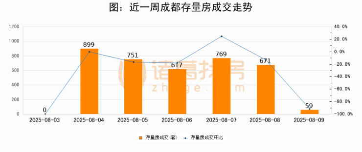 从存量房来看,2025年08月09日成都存量房单日成交59套,比昨日减少612套,环比下降91.2%。从近一周存量房成交来看,成都存量房日均成交套数为538套,08月09日单日成交59套,低于近一周平均水平89%。