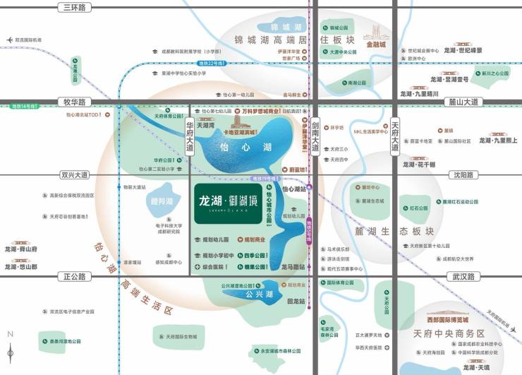 生态:2大湖区:约500亩怡心湖、瞪羚湖;7大公园:怡心城市公园、天府体育公园、叠水公园、华府公园、四季公园、糖果公园、公兴湖湿地公园