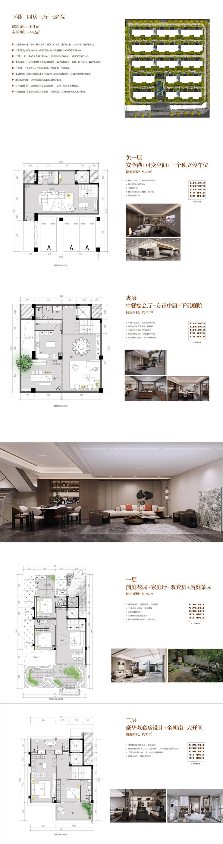 项目以“超高拓展率”为核心卖点,通过地下室、庭院、屋顶花园赠送,实现建面与实得面积1:3.4-4.4的稀缺比例。