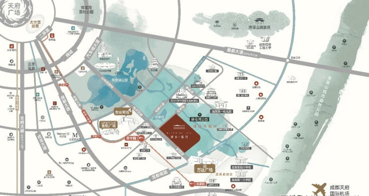 生态:无边界融入1900亩驿马河公园,远眺约5061亩东安湖公园,背靠龙泉山森林公园