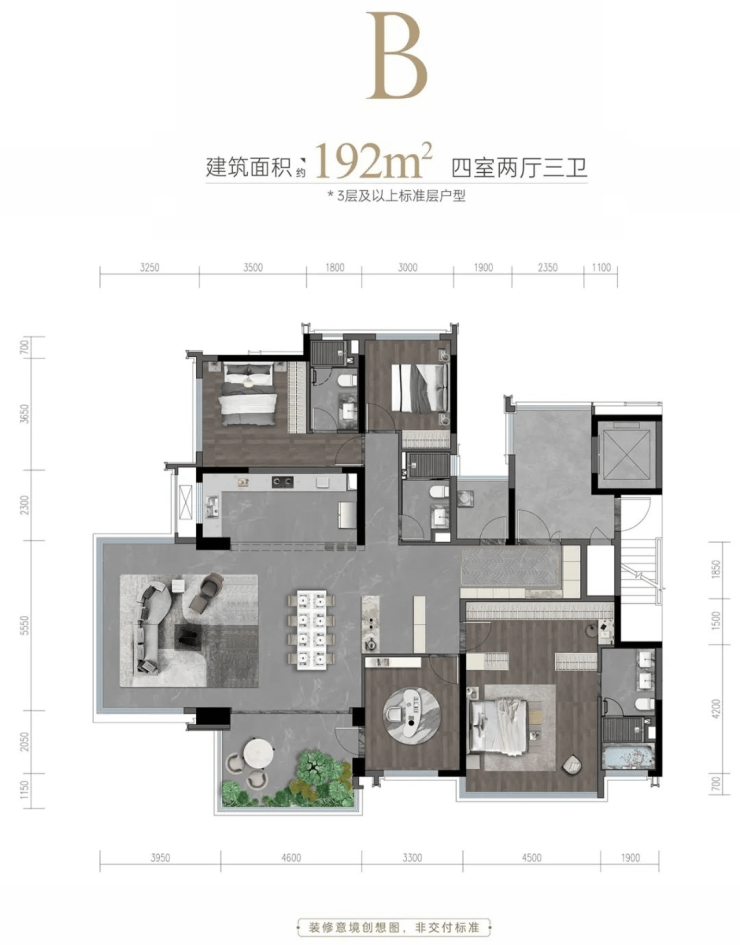 建面约192㎡四室两厅三卫
