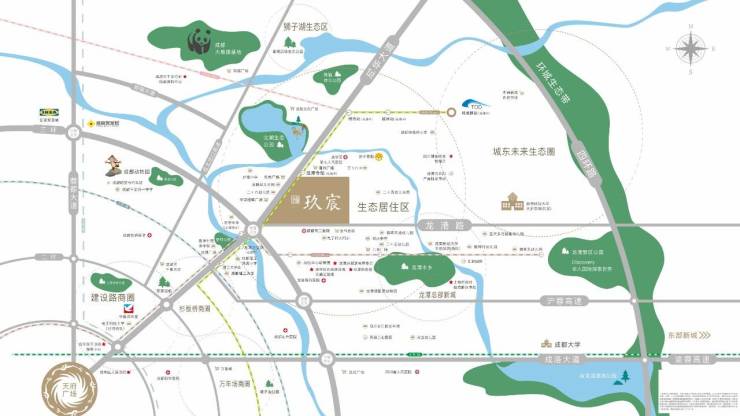 我们项目拥有三横四纵,三地铁的立体交通路网。三横指的是熊猫大道、龙港路、隆兴路,四纵指的是三环路、蜀龙路、成华大道、绕城高速。三地铁指的是8、9、17号线。