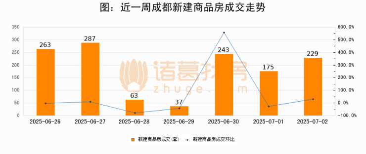 根据成都市住房和城乡建设局数据显示,2025年07月02日成都新建商品房成交229套,较昨日增加54套,环比上涨30.9%。近一周成都新建商品房日均成交186套。07月02日单日成交229套,高于近一周平均水平23.1%。