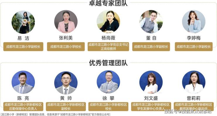 教学班底-教师是学校的根本新都校区由龙江路小学选派管理团队领办,学校管理团队成员均来自名校,全国优秀教师、学科带头人、区特级教师、省骨干教师等,拥有丰富的教育智慧和专业积淀。