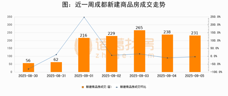 根据成都市住房和城乡建设局数据显示,2025年09月05日成都新建商品房成交231套,较昨日减少7套,环比下降2.9%。近一周成都新建商品房日均成交186套。09月05日单日成交231套,高于近一周平均水平24.2%。