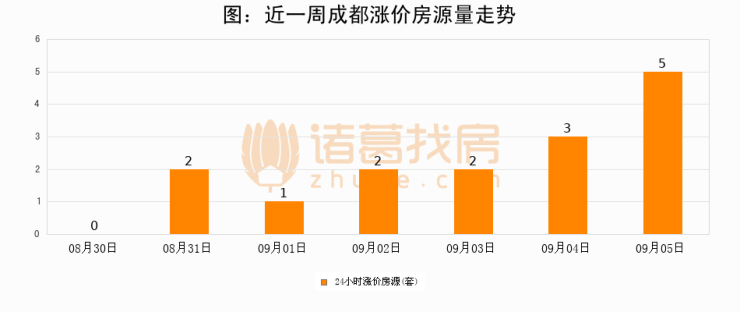 根据诸葛找房数据显示,成都24小时涨价房源量为5套,较09月04日增加2套,环比上涨66.7%。与此同时,涨价房源占比小幅扩大,业主信心有所提升。