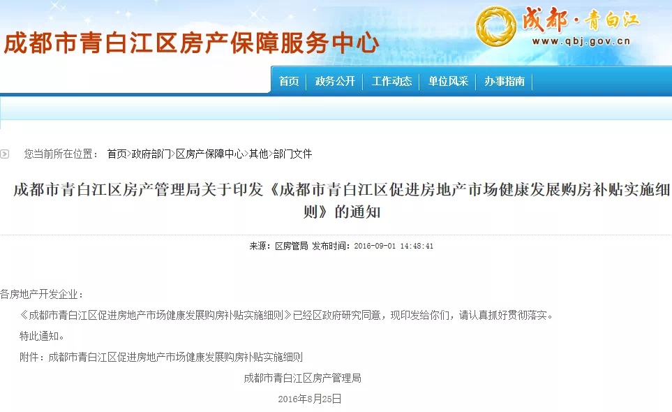 2016年9月1日,成都市青白江区房产管理局发布了《成都市青白江区促进房地产市场健康发展购房补贴实施细则》。