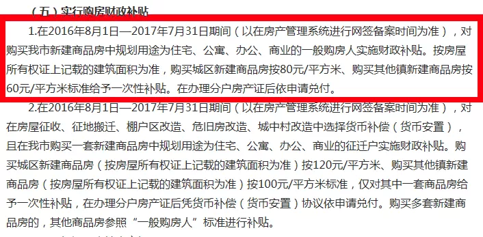 通知中,明确提出实行购房财政补贴:在2016年8月1日—2017年7月31日期间(以在房产管理系统进行网签备案时间为准),对购买我市新建商品房中规划用途为住宅、公寓、办公、商业的一般购房人实施财政补贴。按房屋所有权证上记载的建筑面积为准,购买城区新建商品房按80元/平方米、购买其他镇新建商品房按60元/平方米标准给予一次性补贴。在办理分户房产证后依申请兑付。