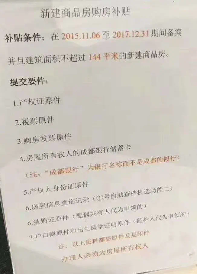 2015年8月,双流区《关于稳定房地产消费需求实施细则》出台,规定凡购买双流县(元华路以西区域)规划用途为住宅、公寓、办公、商业的商品房,且网上签约备案时间为2015年6月2日至2017年6月1日期间的,在取得房屋所有权证后,按房屋所有权证上记载的建筑面积给予每平方米80元的补助,并在办理分户房产证时依申请兑付。