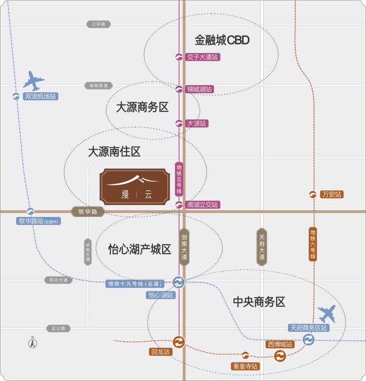 神仙树、金融城CBD、锦城湖、大源商务区、大源南住区、锦江生态带、怡心湖产城区、浅水湾等成都壕宅住区,因剑南大道而串联