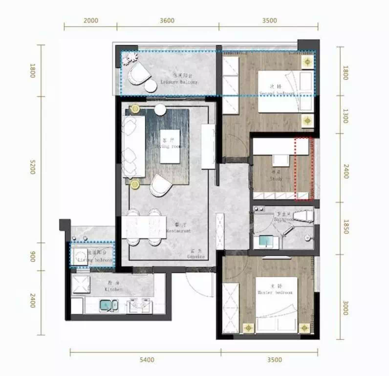 客厅为横厅设计,与98㎡户型相比,动静分区不明显,三间卧室围合分布于客厅两边,但胜在每一个卧室的窗户都很大,朝向西南采光更好,南北较通透。