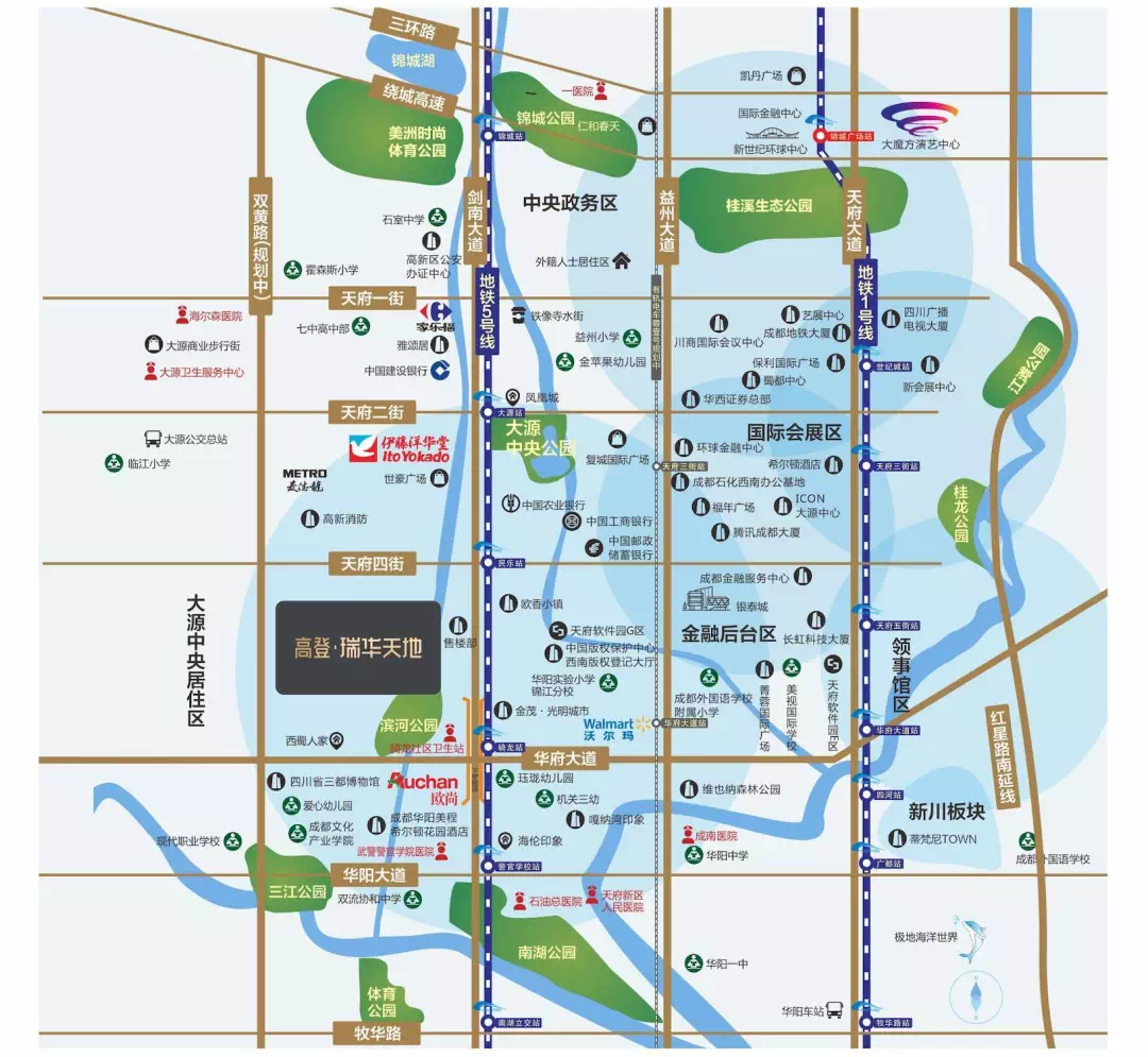 高登瑞华天地位于剑南大道南段西侧,属于双流区(购房需要11区资格),它的位置和远洋万和公馆类似,都是处于三区交界的尴尬位置。