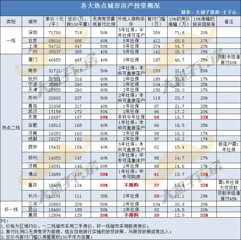3.关于投资回报。为了便于大家理解,表中以100平/套来计算总价,统一以10%的房价涨幅来计算投资回报率,通过不同城市的投资回报率,大家就可以直观看到不同城市的回报差异。