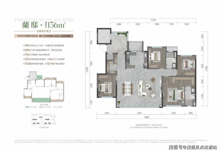 约10㎡全采光入户光厅,约69㎡LDKG 超越级宽奢方厅,引领主流改善;约11㎡中西奢厨+岛台空间布局,满足多样烹饪需求;约27㎡南向奢阔主卧套房,约6㎡步入式衣帽间;约15.8m南向奢尺面宽,约12+4㎡南北双阳台 。