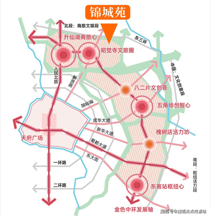 成华高质量发展的新动脉——串联成华区东客站TOD-东郊记忆商圈- CCD中央文创商务休闲区等城市核心节点,耦合都市文旅、数字创新、智慧服务、枢纽活力四大功能圈。