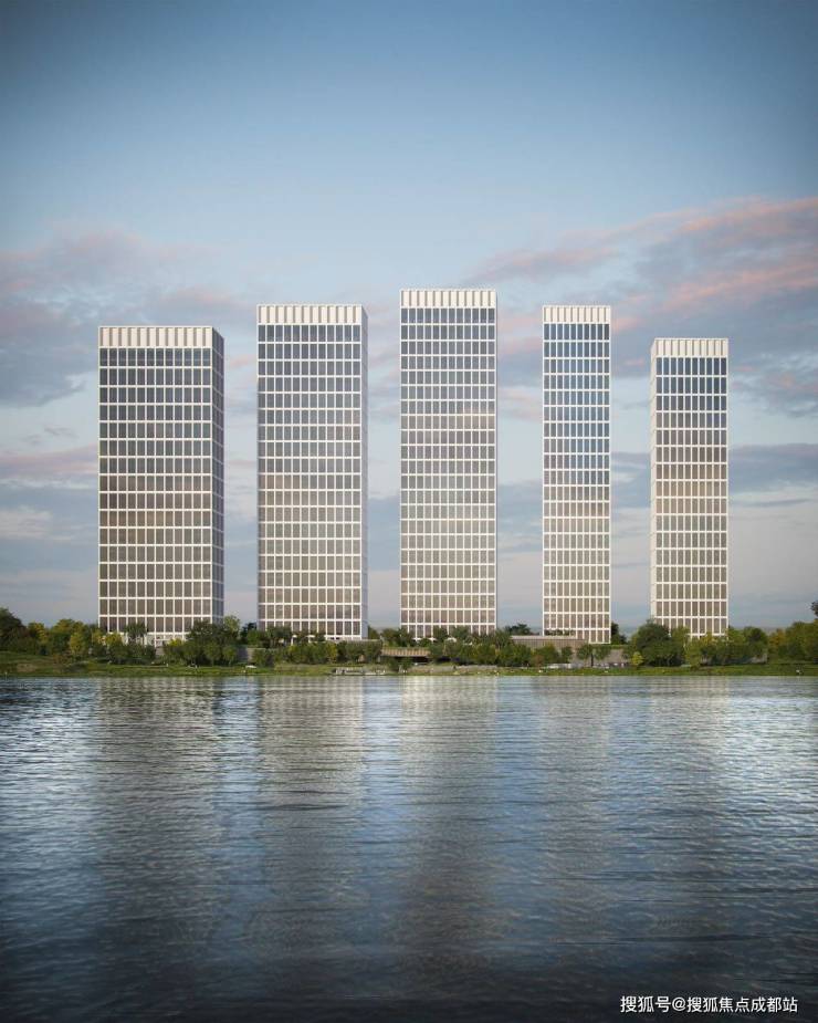 蔚蓝湖滨3号融合现代艺术与湖滨自然之美,五栋艺术建筑拔地而起,如雕塑般矗立湖畔,勾勒出起伏有致的城市天际线。