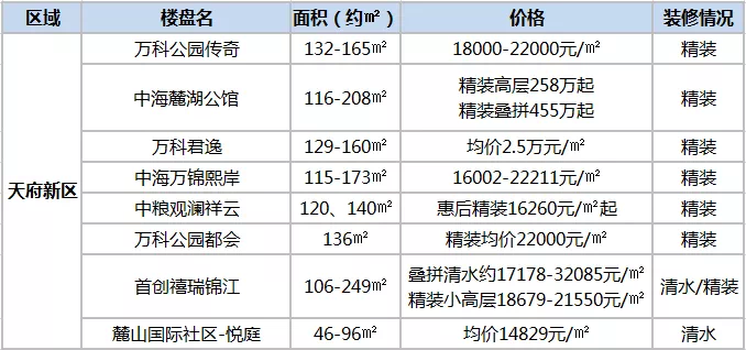 天府新区在售楼盘有8个,除了麓山国际社区-悦庭有建面约46平米的极刚户型外,其他项目的面积都在百平以上。