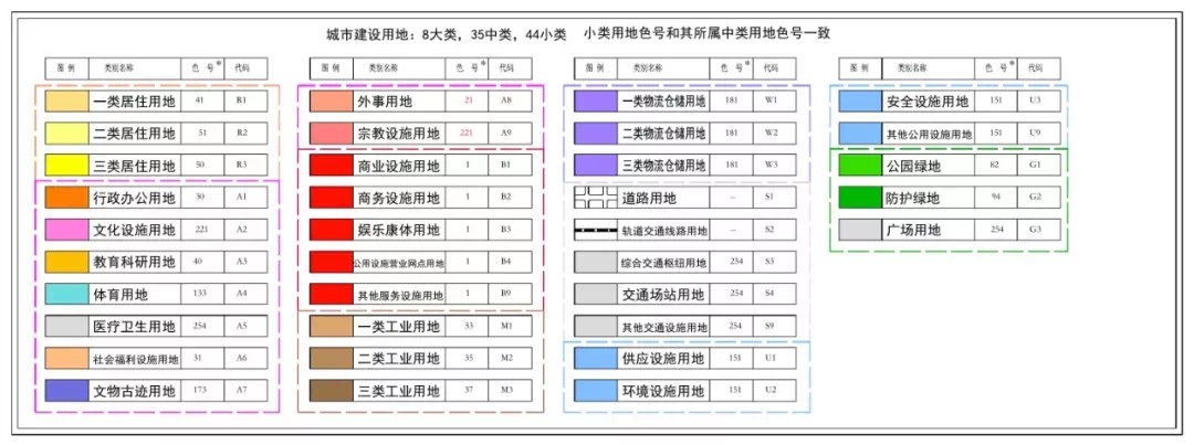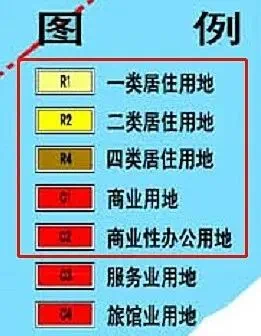 规划图一般都自带图例,里面标注的不同颜色就代表了不同性质的用地类型,而我们只需要重点关注几个颜色:
