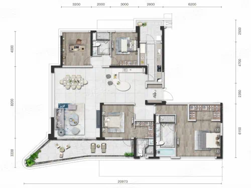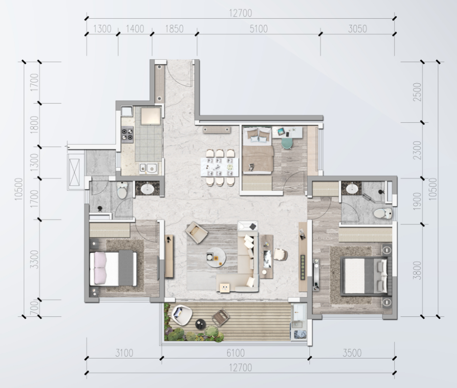 ▌成都阳台3.0版本之二:270°观景阳台如今,对于一些高改项目而言,单纯地把面积做大已经无法满足购房者的改善需求,如何在同样的面积中,做出较大化的空间感和尺度感,才是开发商产品研发的重点。于是,阳台成为他们的“道场”。不少开发商在过去单纯地把阳台做长基础上,通过户型创新,做出270°转角大阳台,一方面客餐厅可以实现两面甚至三面采光,一方面也能扩大室内空间感。如德商锦江天玺建面约205㎡“飞机舱”户型,客餐厨LDK一体式设计,三面采光,转角式景观阳台可实现270°观景;又如西派国樾建面约350㎡户型,同样拥有一个超长转角式阳台,联通客厅与书房、主卧。