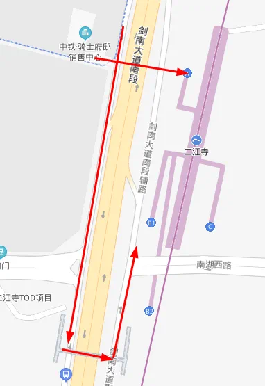 中铁骑士府邸位于站点地铁5号线二江寺站旁,直线距离约200米,但只有剑南大道对面才有站点,虽然与项目售楼部隔路相望,但目前只能通过人行天桥才能乘坐地铁,得多走700米,较为不便。
