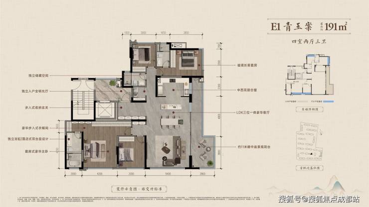 主卧270°观景飘窗:空间奢阔感突出,独立餐厅+中西双厨设计。