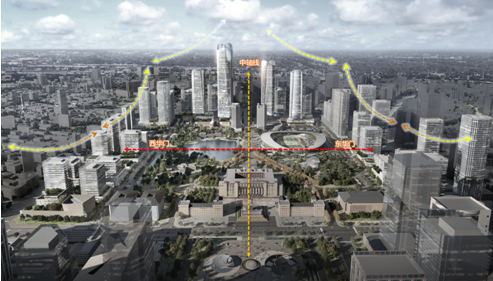 依托地铁及地下空间开发优势和潜力,构建骡马市TOD城市综合体。在平面上,形成东西向街巷空间及南北视线通廊,延续老城历史肌理,并建立与南侧天府文化公园的视线联系。以348米的地标建筑为核心的高层塔楼群,形成城市新经济发展载体,重塑骡马市区域城市活力。