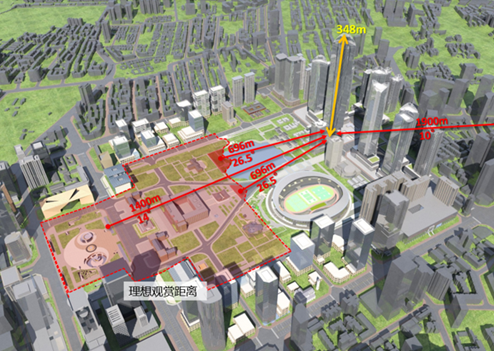 对标志性建筑高度与较佳观赏距离分析,经过地块天际线论证,天府文化公园70%的区域均为较佳观赏区。