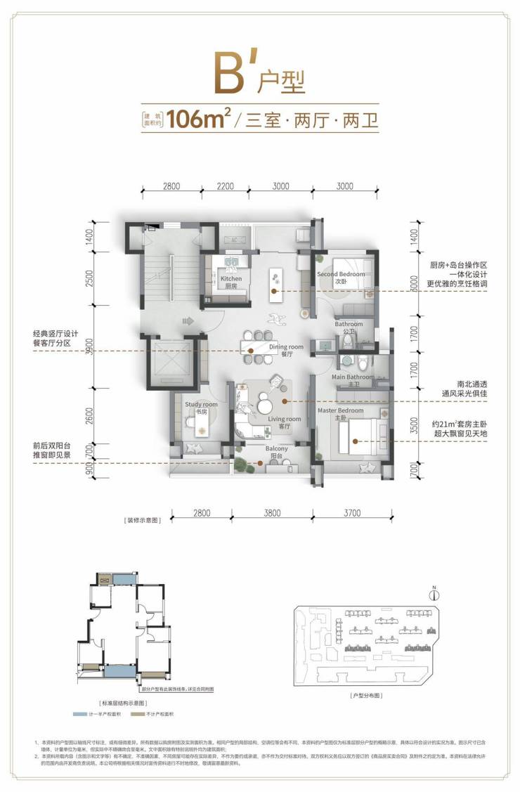 106户型为南北通透的竖厅设计,主客分离,充分保障了居住的私密性。
