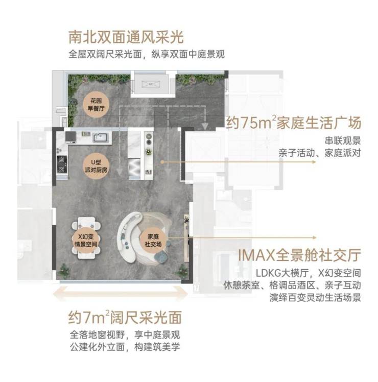 项目充分利用新规再做突破,真正地实现了同等面积下家庭空间场景革新,别墅平层化的迭代创造。建面约143㎡央景花园平墅,正瞰中庭景观,成就C位观景正席,当之无愧的央景楼座新款爆品。