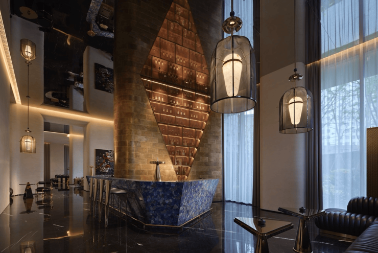 居其—戴昆设计,完美结合成都竹文化,通过将“竹”的诸多意象表达,与墙面、花艺、灯具、摆件等融合,进行艺术再造