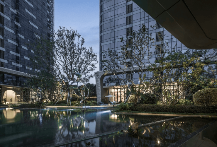 “天才”艺术家向京雕塑,于小区放置了两座雕塑作品,【寂静成型】+【异境—白银时代】。成都唯一一个,也是最先使用艺术大家向京真迹雕塑作品作为景观小品的奢宅