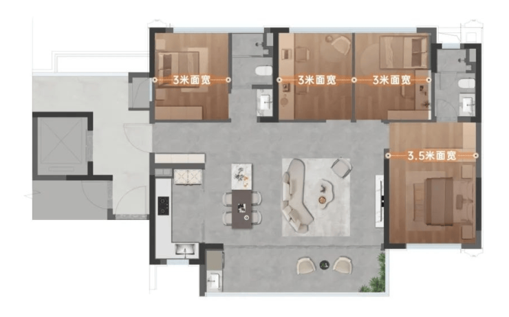 而中环天宸经典LDK横厅四房的尺度下探至建面约123㎡级别,打破过去用143㎡定义住宅改善的标准。