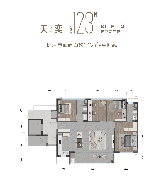 在户型打造上,项目规划建面约110-143-175㎡全景舱奢宅、建面约123-128㎡迭代宽境四房两类产品,在空间尺度、功能布局上进行了系统性升级。