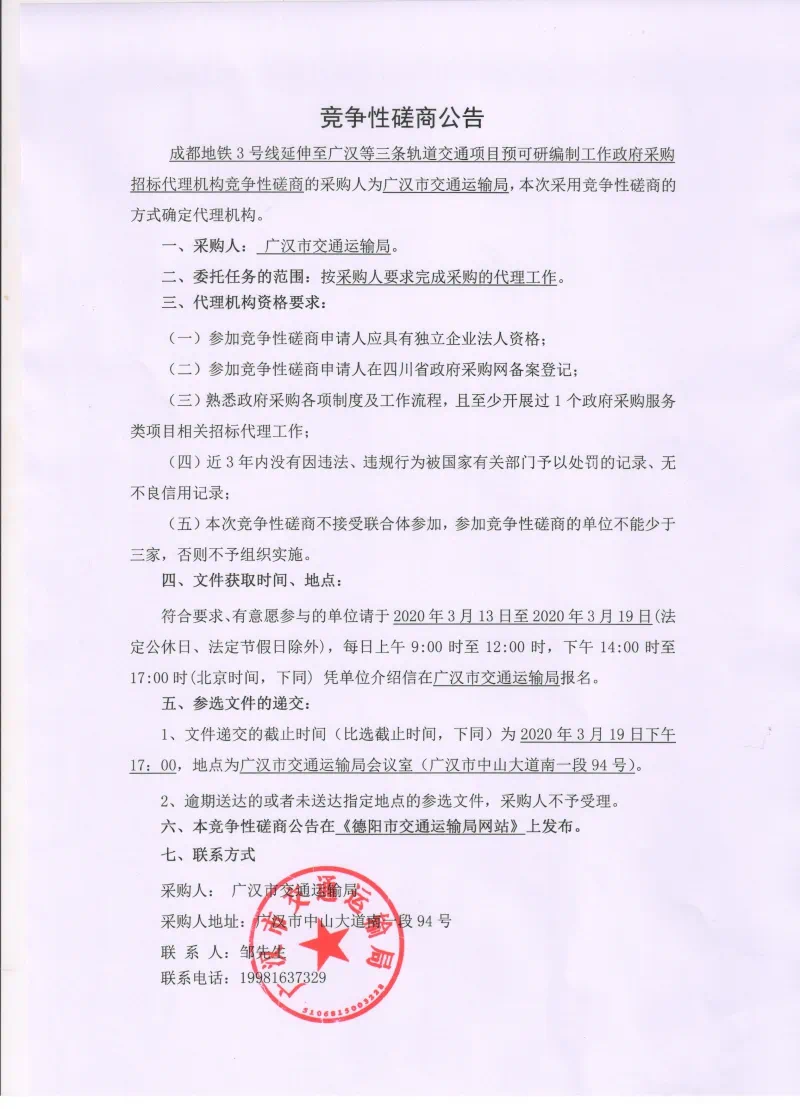 近日,在德阳交通运输局官网上发布了《成都地铁3号线延伸至广汉等三条轨道交通项目预可研编制工作政府采购招标代理机构竞争性磋商公告》。