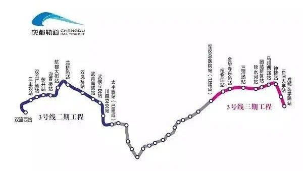 2018年年底,3号线三期北延段开通运行以后,它就成为了成都地铁中里程最长、车站数量最多的一条线路。从成都医学院站到双流西站,南接双流,北连新都。