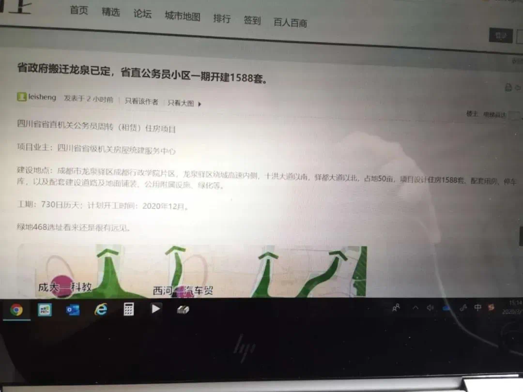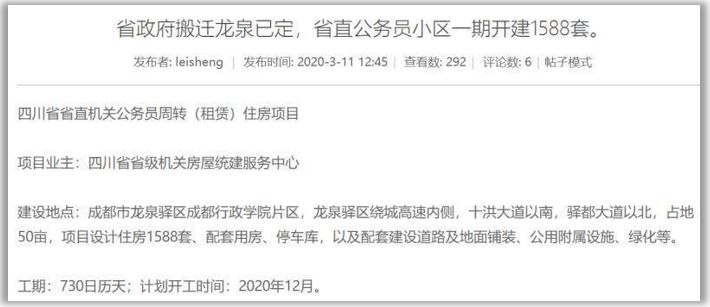 昨天中午,成都某网站论坛出现了一篇名为《省政府搬迁龙泉已定,省直公务员小区一期开建1588套》的帖子(现已被删除)。
