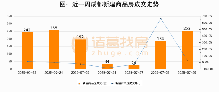 根据成都市住房和城乡建设局数据显示,2025年07月29日成都新建商品房成交252套,较昨日增加68套,环比上涨37%。近一周成都新建商品房日均成交170套。07月29日单日成交252套,高于近一周平均水平48.2%。