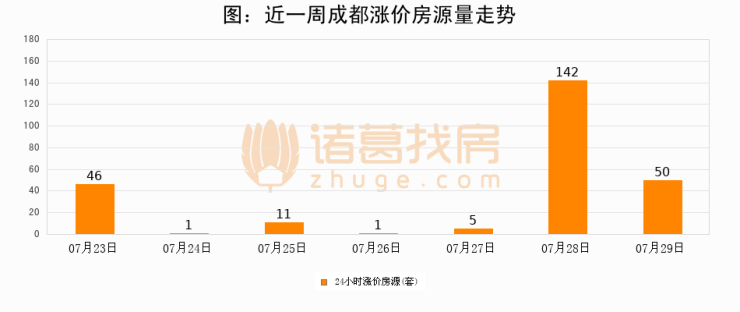 根据诸葛找房数据显示,成都24小时涨价房源量为50套,较07月28日减少92套,环比下降64.8%。与此同时,涨价房源占比小幅回落,对于购房者来说是一个入市窗口期,购房者可抓住时机入市。