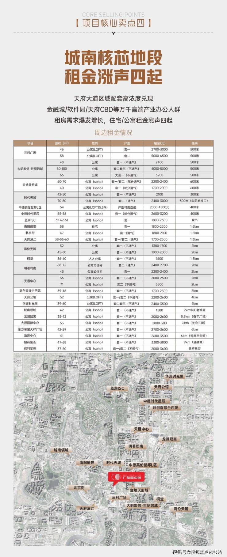 项目雄踞天府大道1888号黄金地段,坐拥金融城、新川科技园、天府中央商务区三区交汇的稀缺位置。作为天府大道中轴线上稀缺的小户型产品,具备水电气三通优势,周边竞品稀缺。