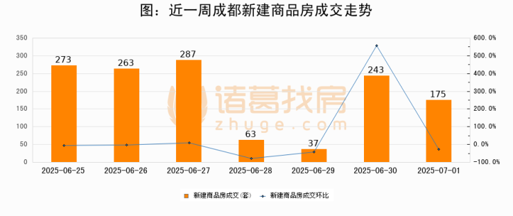 根据成都市住房和城乡建设局数据显示,2025年07月01日成都新建商品房成交175套,较昨日减少68套,环比下降28%。近一周成都新建商品房日均成交192套。07月01日单日成交175套,低于近一周平均水平8.9%。