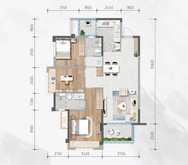建面约108㎡套三户型: