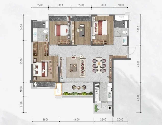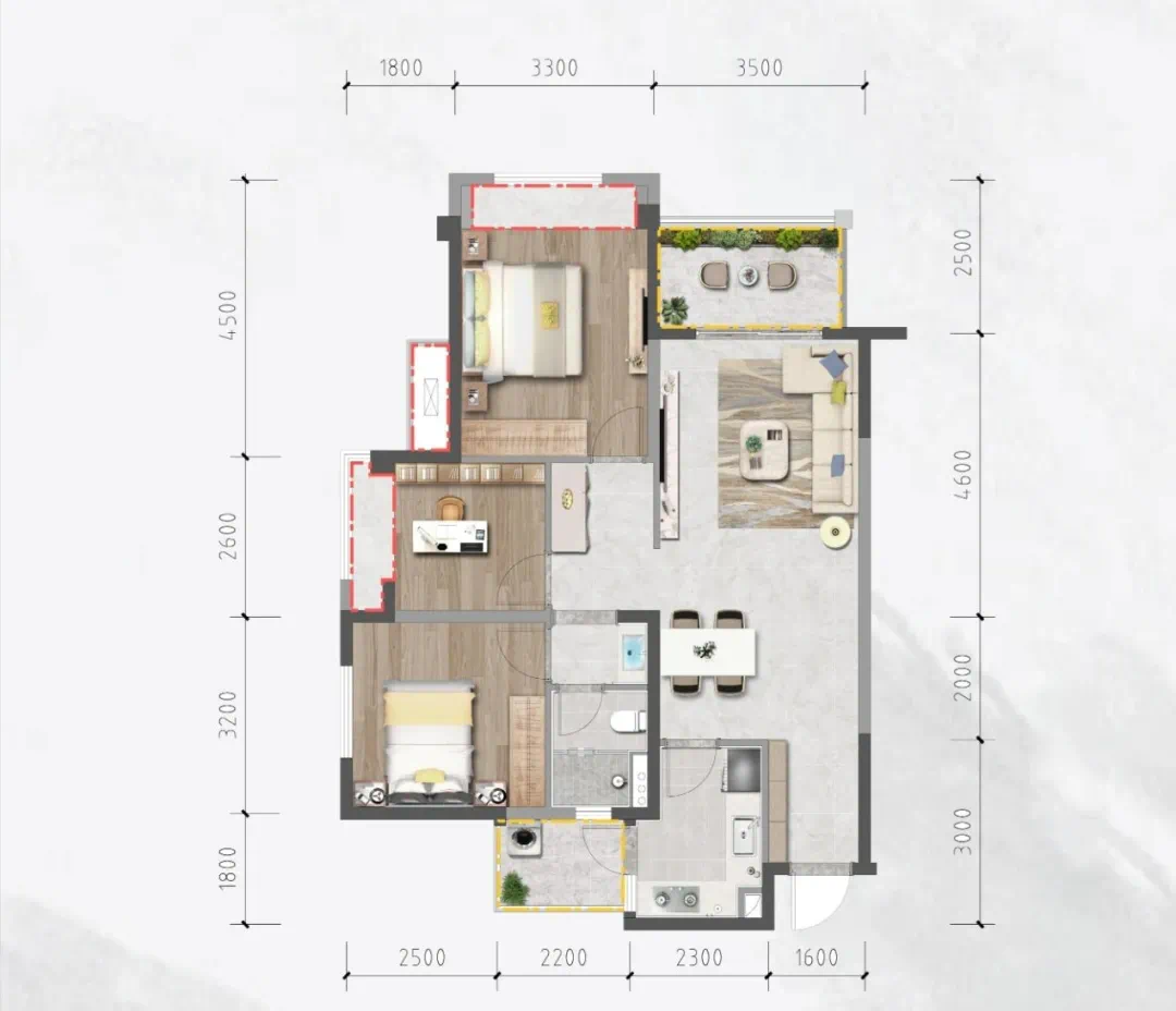 卧室分布在餐客厅两侧,动静分区欠佳。厨房双排设计,较为宽敞,四个卧室都带有飘窗,采光较好。可以享受双中庭景观。