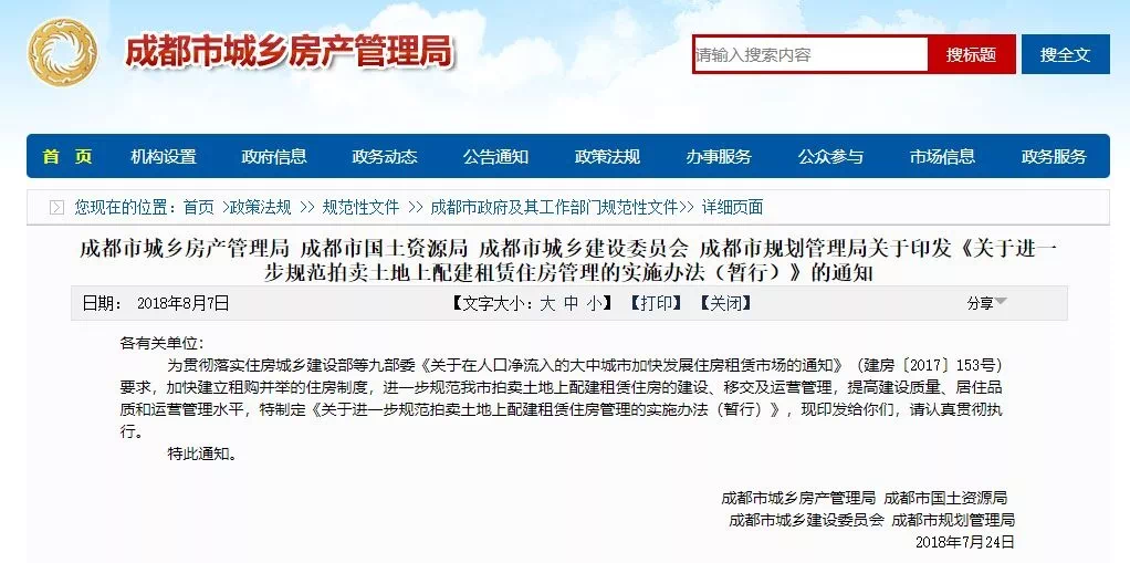 2018年8月7日,成都市出台《关于进一步规范拍卖土地上配建租赁住房管理的实施办法(暂行)》的通知,明确将区域内拍卖土地上配建并移交给接收单位的租赁住房(含地下车位)的建设、移交及运营管理规范化。