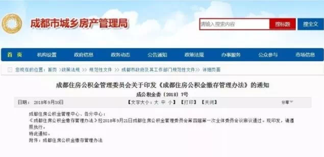 2018年9月30日,成都住房公积金管理委员会发布《成都住房公积金缴存管理办法》通知,同时发布的还有《成都住房公积金个人住房贷款管理办法》。
