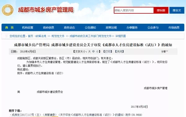 2018年4月8日,成都市城乡房产管理局、成都市城乡建设委员会印发《成都市人才住房建设标准(试行)》。