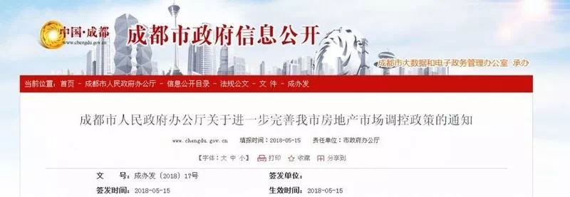 2018年5月15日,成都市人民政府办公厅发布了《关于进一步完善房地产市场调控政策的通知》。