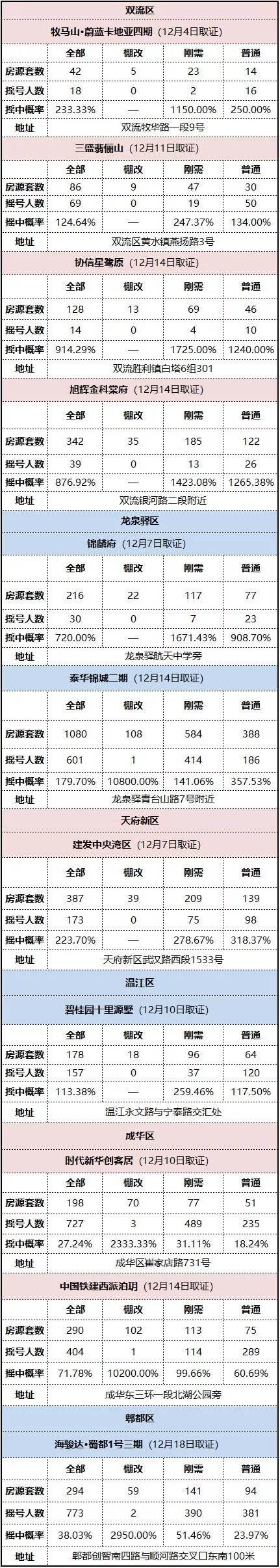 来看下成都一二圈层今年12月1日以来,截止到12月18日,取证,并已摇号、选房结束的项目的中签率: