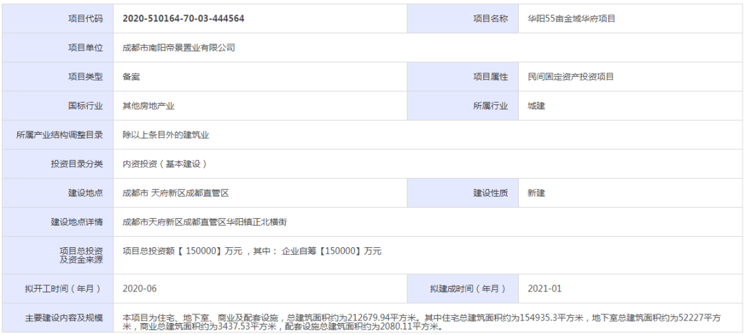 日前,项目名称“华阳55亩金域华府项目”完成备案,项目单位为成都市南阳帝景置业有限公司(以下简称南阳帝景置业)。